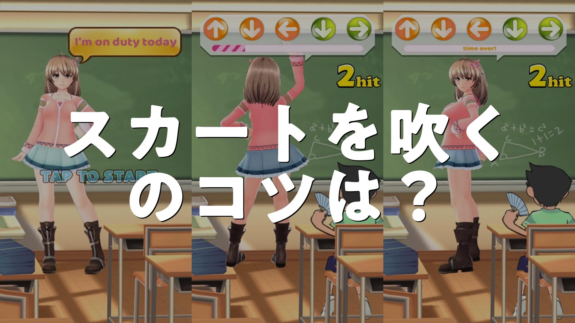 まずは画面に表示される矢印の向きに合わせてスカートの位置を狙い、タップすることで吹き付けられます。矢印は次第に増えていき、的確に狙って吹き付ける必要があります。吹き付ける成功回数に応じて、最終的にはある場所で終わる仕組みとなっています。コツをつかめば、楽しい時間を過ごせること間違いありません。