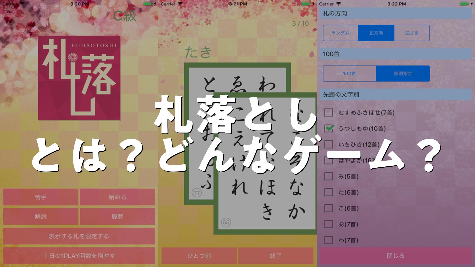 札落としは、上の句が読まれたら、その下の句の決まり字を素早く言って札を払う、競技かるたをモチーフにしたゲームです。アプリ内では、上の句が表示された状態で下の句が表示されるので、下の句の決まり字を瞬時に思い浮かべて、札を払っていきます。練習を重ねることで、素早く札を払えるようになっていきます。