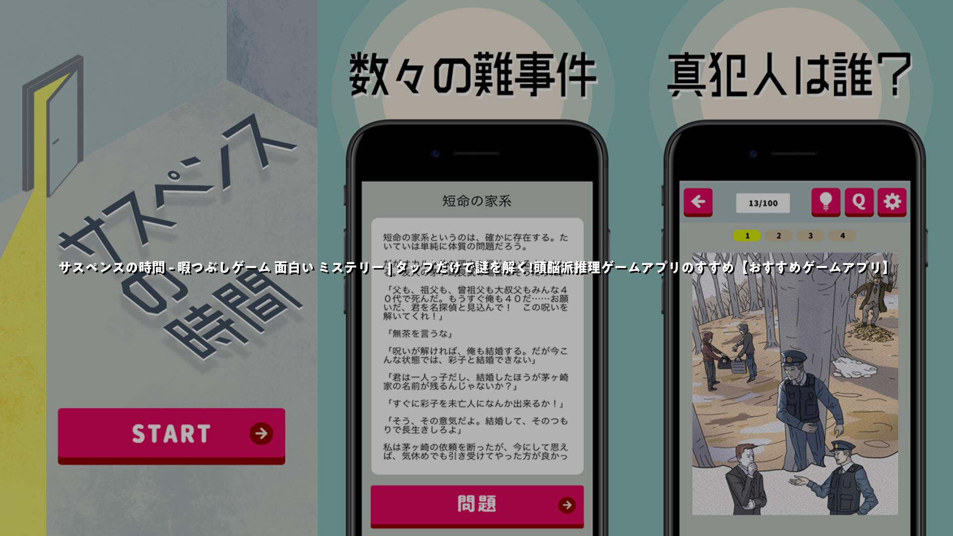 「サスペンスの時間」は、シンプルな操作で誰でも気軽に楽しめる推理ゲームアプリです。通勤通学の空き時間などに活用できるほか、ミステリー好きにもおすすめの作品となっています。