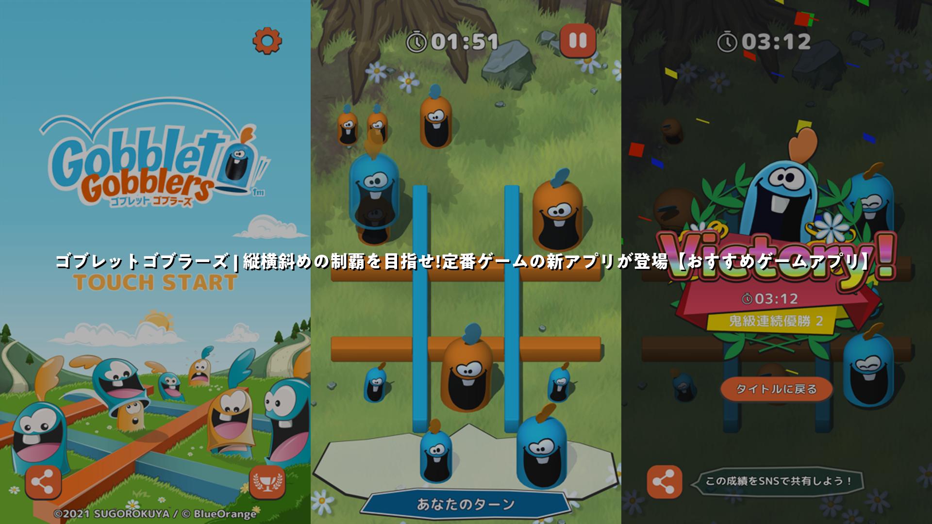 『ゴブレットゴブラーズ』は、3×3マスの盤面に自色のコマを置いたり動かしたりして、縦横斜めの1列を作る独創的なボードゲームです。アプリ版では、トーナメント形式の「勝ち抜き戦」や、気軽に1戦遊べる「練習戦」などのモードが用意されており、ボードゲームの楽しさをスマホで手軽に体験できます。また、難易度の異なる3つのモードを選択できるので、初心者から上級者まで楽しめます。