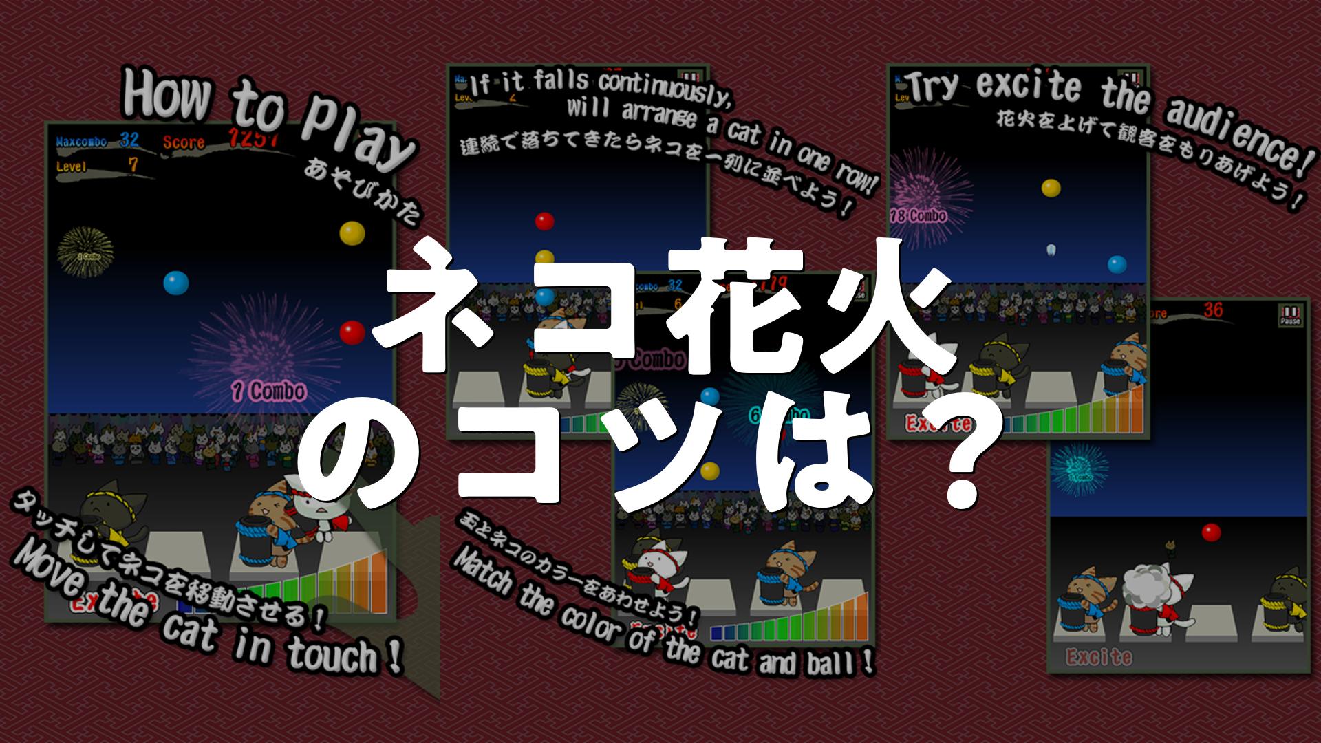 落ちてくる玉の色と同じ色のネコを移動させて玉を受け取り、花火を打ち上げていきます。ネコが重なっている場合は手前のネコを動かせるので、素早くネコを操作して玉をキャッチしましょう。Exciteバーが0になるとゲームオーバーなので、玉を落とさずに花火を打ち上げ続けることが重要です。