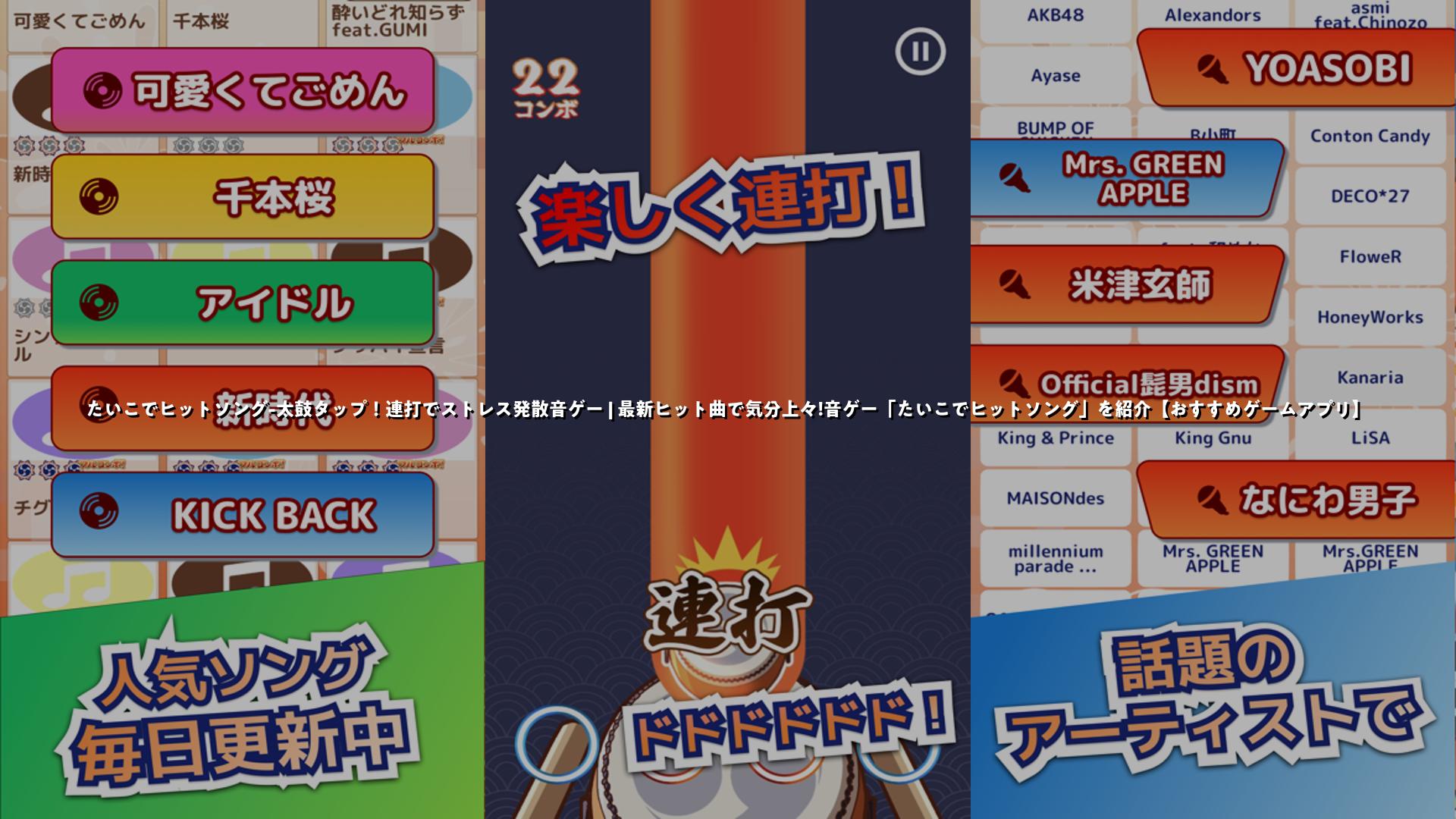 たいこでヒットソング-太鼓タップ!連打でストレス発散音ゲー | 最新ヒット曲で気分上々!音ゲー「たいこでヒットソング」を紹介【おすすめゲームアプリ】