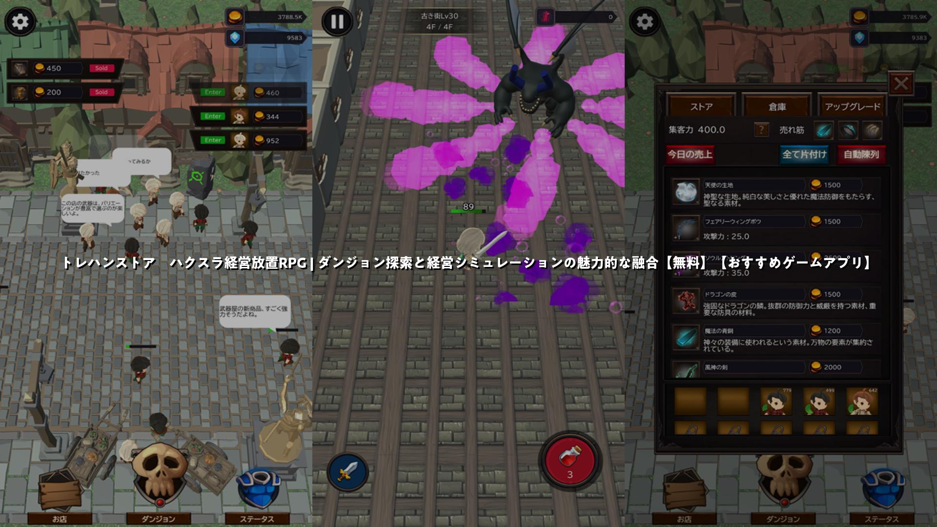 このアプリは、ダンジョンを探索して装備アイテムを集め、それを販売してお店を運営するという、ハクスラとシミュレーションが融合したオススメのアプリです。