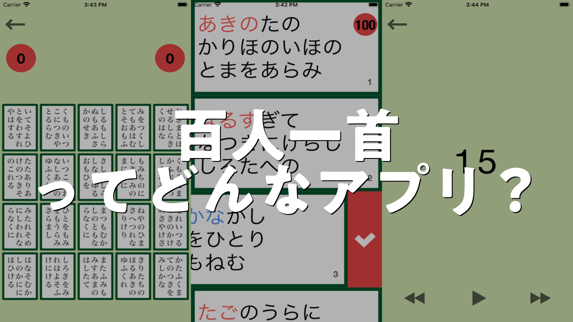 百人一首アプリ「わかなつむ」を使ってみたところ、とても使いやすくておすすめです。設計が丁寧で、百人一首を楽しみながら確実に覚えられるのが魅力です。音声で歌を聞きながら単語を覚えられるほか、ゲーム感覚で札を取ることもできるので、百人一首をプレイしたい人にぴったりです。シンプルで分かりやすい機能が揃っているため、初心者も安心して利用できます。百人一首好きにはもちろん、これから挑戦したい人にもおすすめの一品です。
