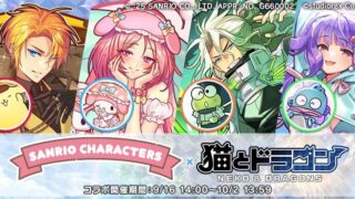 ニュース 『猫とドラゴン』×『サンリオキャラクターズ』:第二弾コラボキャンペーンを9月16日(火)より実施 ニュースの要約 『猫とドラゴン』と『サンリオキャラクターズ』の第二弾コラボキャンペーンが9月16日(火)より実施 コラボガチャやイベント、ログインボーナスなどでサンリオキャラクターのアイテムが手に入る コラボ期間中はサンリオキャラクタ... 2025.09.16 ニュース