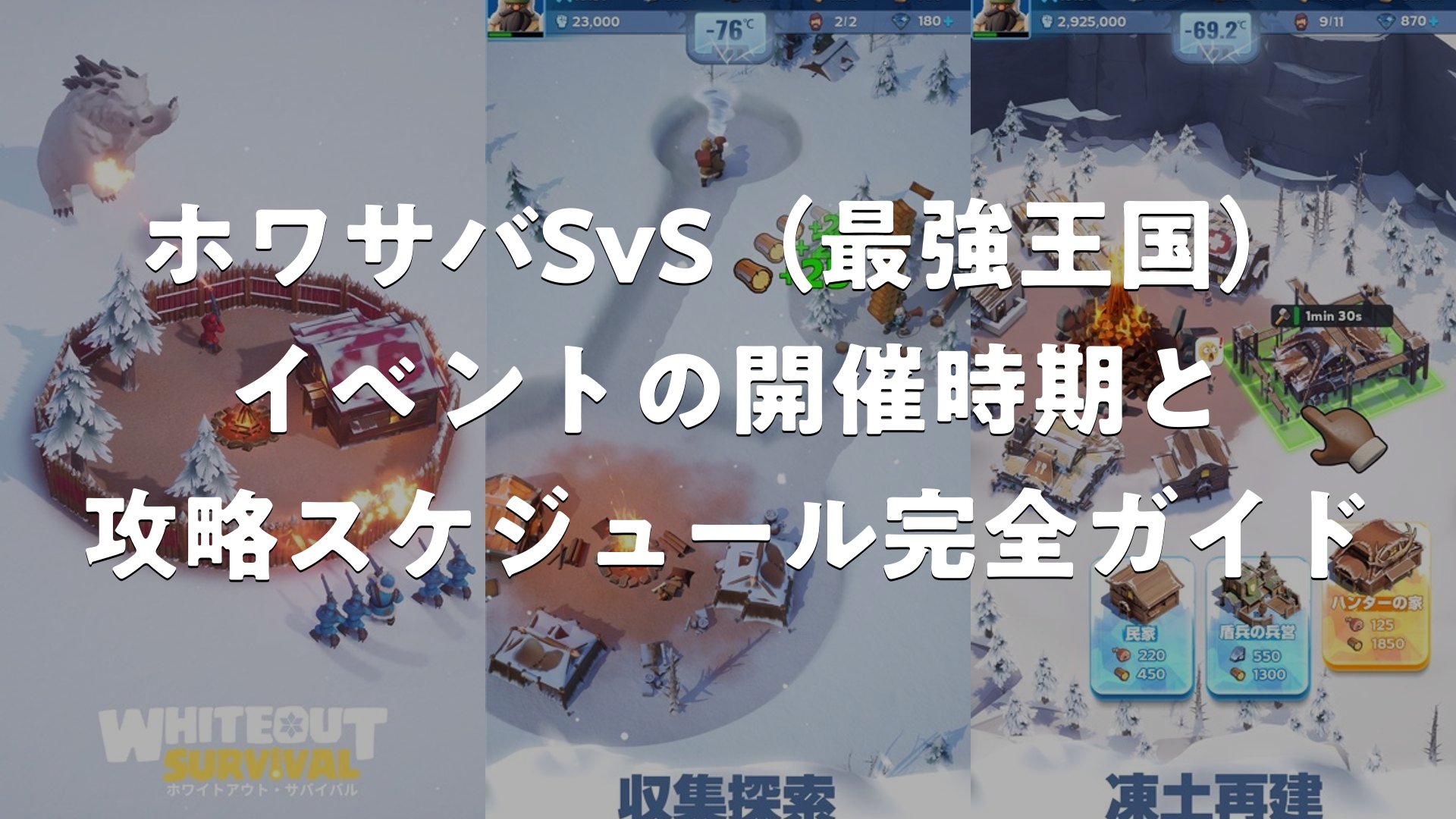 ホワイトアウトサバイバル(通称ホワサバ)のSvSは、別サーバー同士が激しく競い合う大規模イベントで、参加するプレイヤーにとって王国全体の結束を強め、豊富な報酬を獲得する絶好の機会です。このイベントは約10日間にわたり展開され、準備から本格的な戦闘まで多様なフェーズが用意されており、戦略的な準備とチームワークが勝利への鍵となります。SvSを通じて、プレイヤーは自身の成長を実感し、王国をより強固なものに育てることができます。