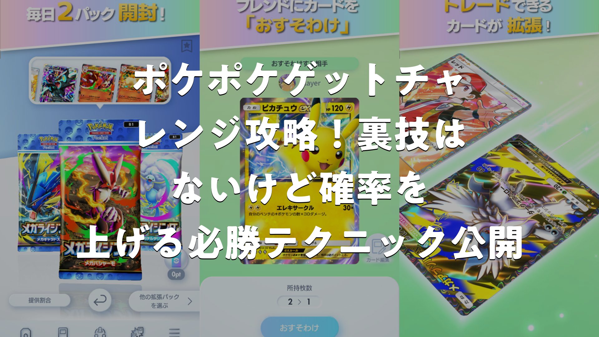 ポケモントレーディングカードゲームポケット(通称ポケポケ)のゲットチャレンジは、プレイヤーが魅力的なカードを手に入れるための楽しい機能です。他のプレイヤーが開封したパックから5枚のカードが提示され、その中から1枚を選択して獲得できる仕組みで、チャレンジパワーを3つ消費して挑戦します。このモードは運要素が強いながらも、戦略的に楽しむことでコレクションを充実させることが可能です。毎日のログインやパック開封を通じて蓄積されるチャレンジパワーを活用し、欲しいカードに近づく機会を増やせます。