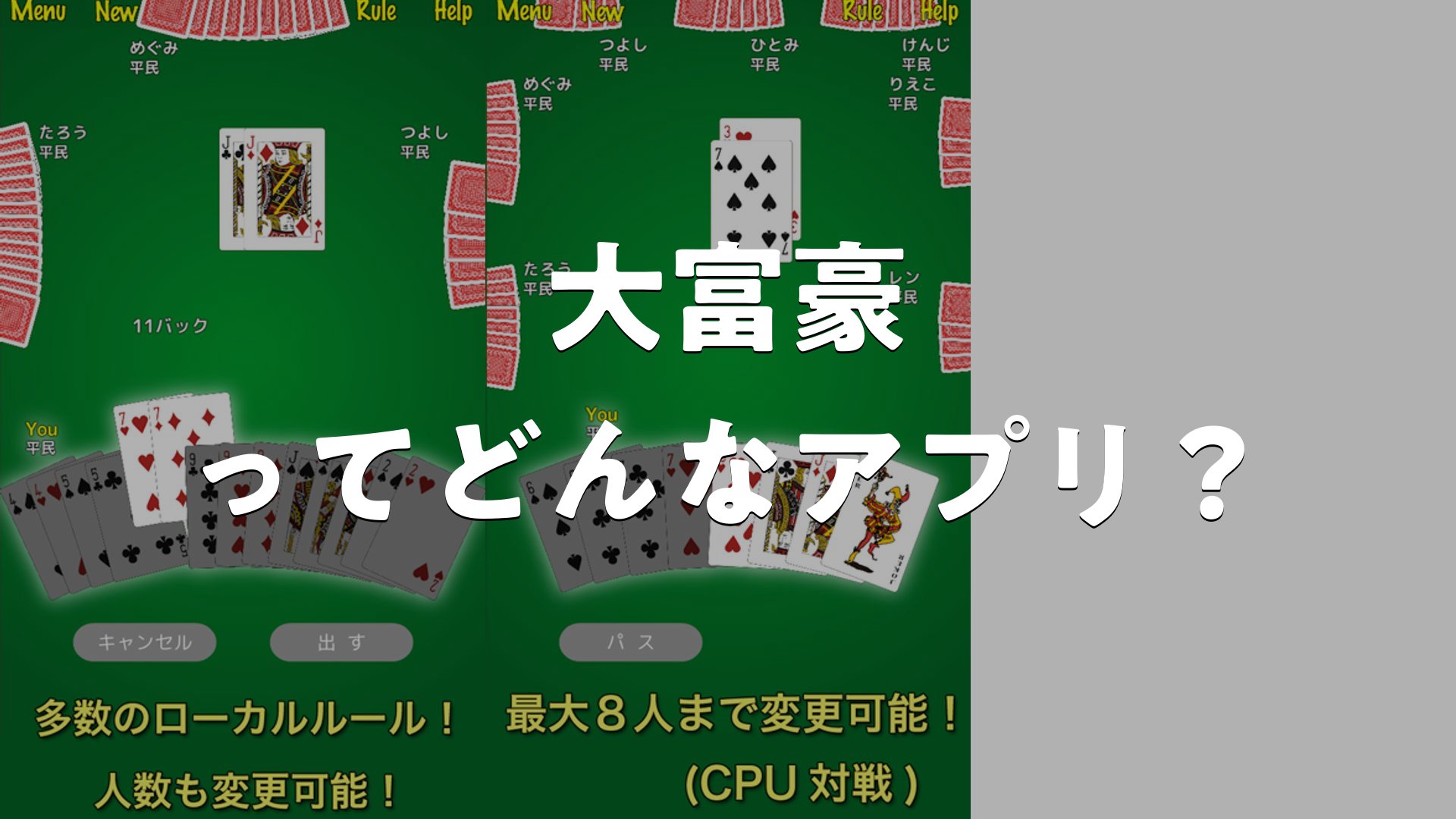 特に大富豪のローカルルールを覚えたい方や、じっくりCPU戦で腕を磨きたい人にピッタリ。