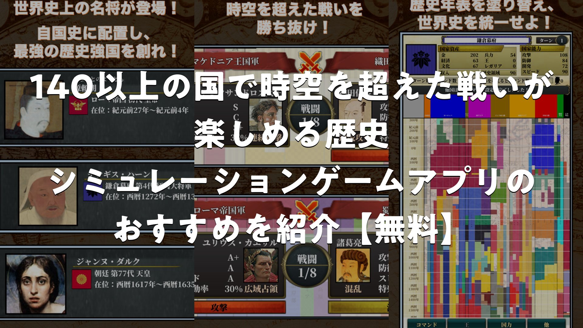 歴史上の人物を率いて世界統一を目指せる歴史シミュレーションの無料アプリのおすすめをまとめました