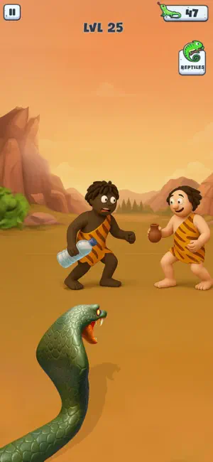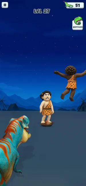 アプリ全体がコミカルでポップなデザインで統一されています。巨大トカゲのキャラクターはゆるくてかわいらしいビジュアルで、原始人たちの表情やリアクションも非常にユーモラスです。操作はタップやスワイプを中心としたシンプルなUIで、直感的にプレイを楽しめます。効果音も充実しており、原始人が叫んだり逃げ回ったりする音が臨場感を高めてくれます。全体的にカジュアルゲームらしい親しみやすいデザインで、幅広い年齢層が楽しめるビジュアルに仕上がっています。