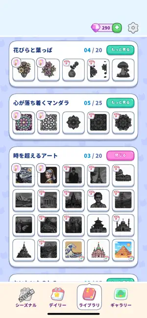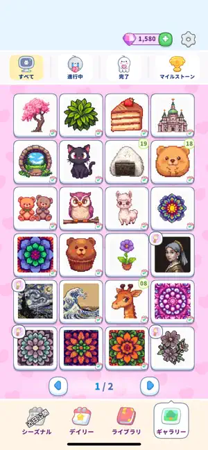 このアプリの最大の魅力は、毎日新しいパズルが追加される「デイリーパズル」機能です。年間365枚のパズルが用意されており、毎日飽きることなく新しい作品に挑戦できます。テーマも非常に豊富で、花や植物などの自然、子猫や子犬などの動物、ユニコーンやクリスタルのファンタジー、さらには「神奈川沖浪裏」や「モナ・リザ」といった名画のピクセルアート版まで、100以上のカテゴリが揃っています。
