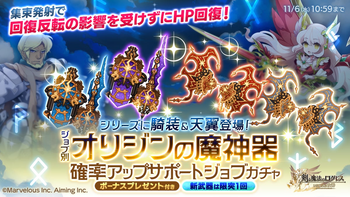 今回のアップデートの目玉は、新武器シリーズ「オリジンの魔神器」に騎装と天翼が加わったことです。これらは最大3回使用可能な「集束発射」スキルを持ち、HP回復効果は回復反転の影響を受けません。さらに騎装は味方全体の蘇生とダメージ上限固定、天翼はリロード大幅短縮とモーション速度上昇など、パーティの支援力が飛躍的に向上します。現在「ジョブ別オリジンの魔神器確率アップサポートジョブガチャ」で入手可能で、11月6日10:59までの期間限定です。