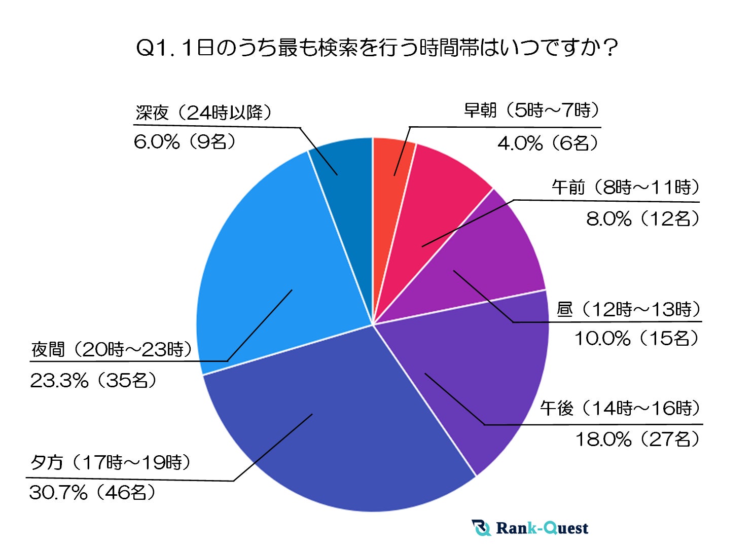 今回の調査は、SEOサービス会社ランクエストによって2025年1月に実施されました。対象は10代男女150名で、時間帯・場所・検索ジャンル・キーワードの4つの視点でデータ収集。特に複数回答可能な問いには最大2つまでの選択制限を設け、日常的な検索行動の優先度が明確になるよう工夫されています。