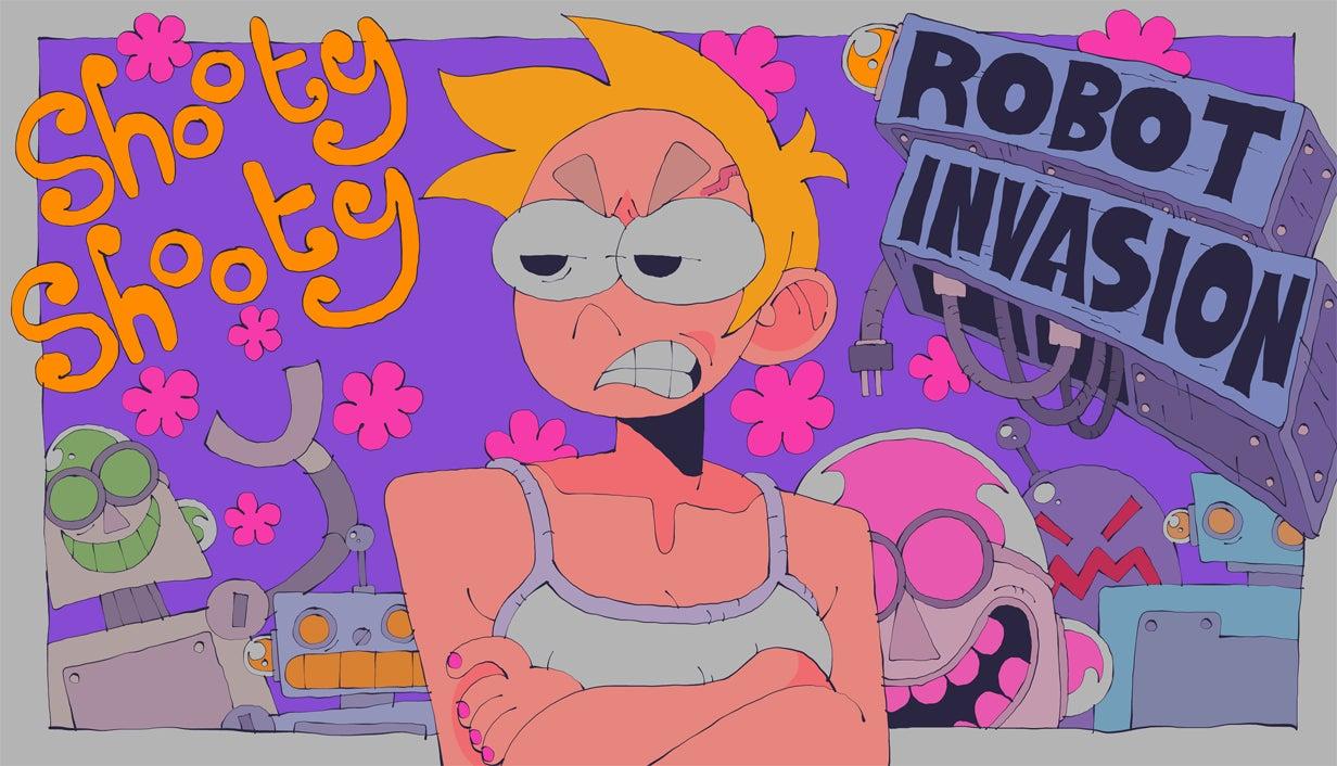 2025年7月11日にSteam向けにリリースされた不条理FPS×インタラクティブフィクション『Shooty Shooty Robot Invasion』が、Steam日替わりセールにて50%オフの600円で期間限定で販売されています。