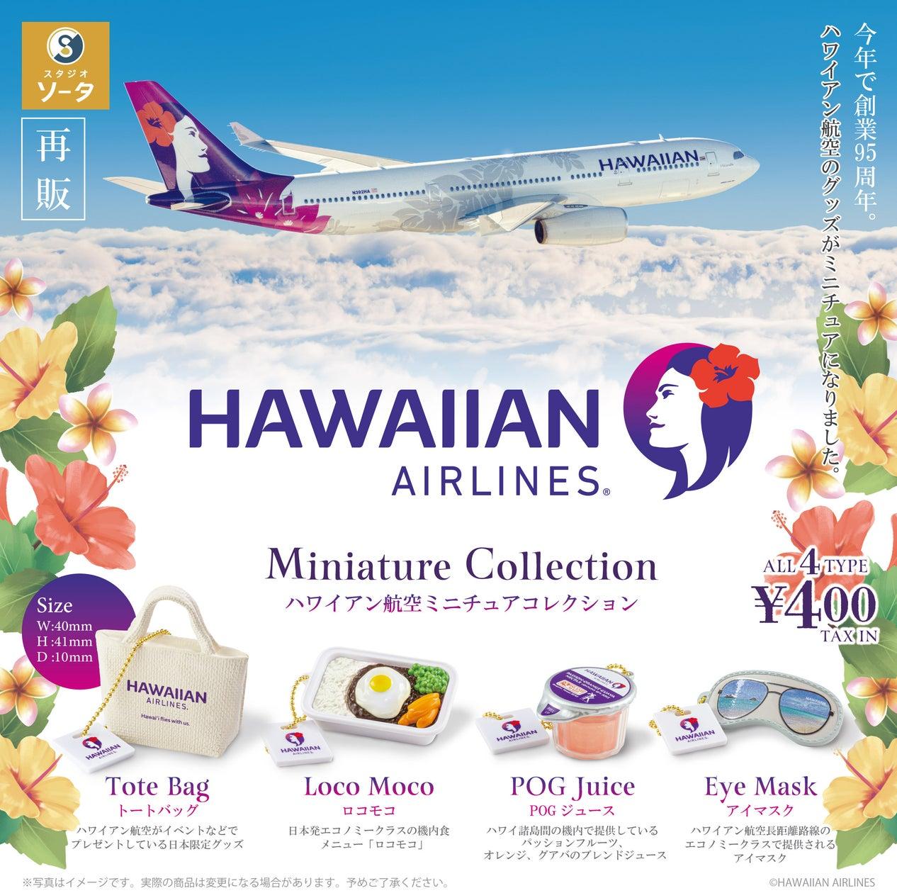 今回のコレクションには、トートバッグやロコモコ、POG ジュース、アイマスクなど、機内で実際に提供されているハワイアン航空のグッズをミニチュアサイズで再現した全4種類の商品が用意されます。価格は1個400円(税込)で、対象年齢は15歳以上となっています。