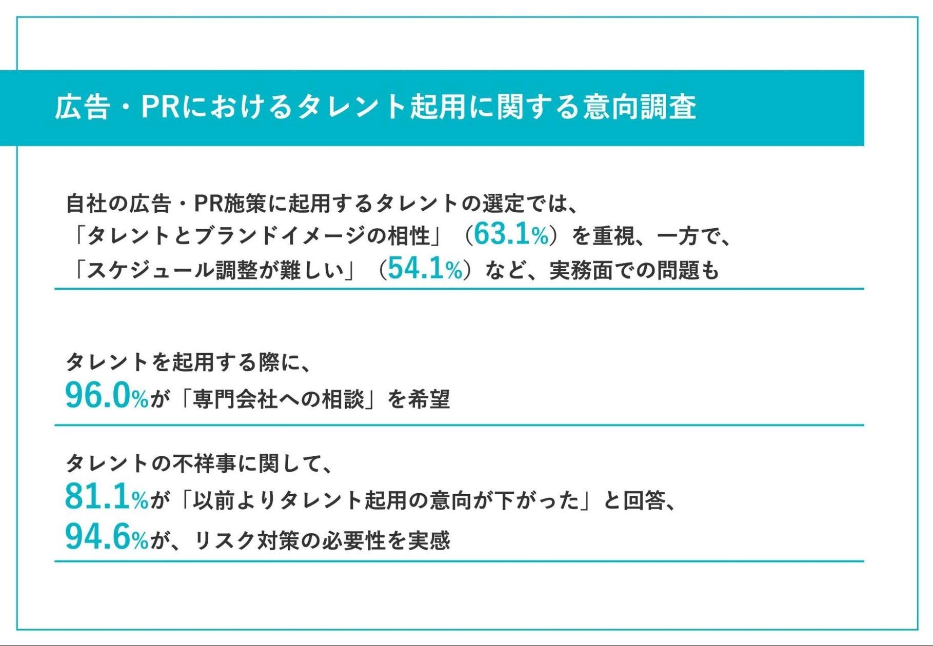 調査の結果、自社の広告・PR施策に起用するタレントの選定では「タレントとブランドイメージの相性」や「ターゲット層との親和性」が重視されている一方で、「スケジュール調整が難しい」「効果測定が難しい」など、実務面での問題が浮き彫りになりました。また、90.1%の企業が自社の広告・PR施策へのタレント起用に前向きで、96.0%がタレントを起用する際には専門会社への相談を希望していることがわかりました。さらに、直近のタレントによる不祥事のニュースを受けて、81.1%の企業が以前よりタレント起用の意向が下がり、94.6%がタレントの不祥事によるリスク対策の必要性を感じていることが明らかとなりました。