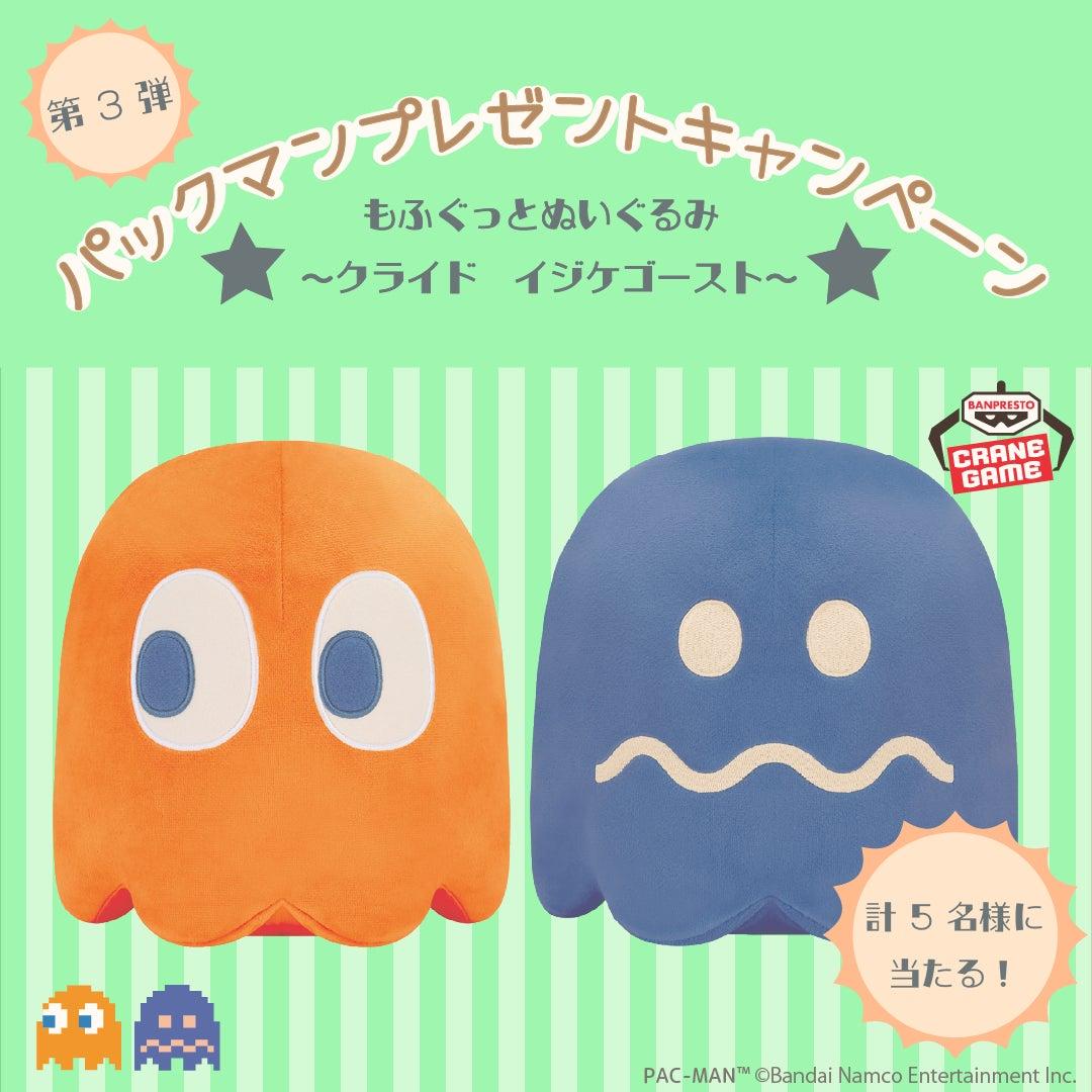 また、パックマン公式Twitterアカウント(@BNEI_PACMAN_JP)では、3か月連続のプレゼントキャンペーンの第3弾を本日より開催中です。今回の景品は人気のアミューズメントグッズ「めちゃもふぐっとぬいぐるみ」シリーズより「クライド&イジケ」で、抽選で5名様にプレゼントされます。